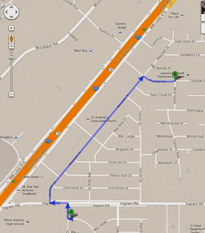 In 1966, after I finished 4th grade, my family moved to San Antonio, and I finished elementary school at Thunderbird Hills Elementary. I walked there, most days. According to Google Maps, it’s only a mile. It felt longer. (My favorite teacher there—possibly my favorite teacher of all—was Mrs. Slovacek in the 5th grade.)