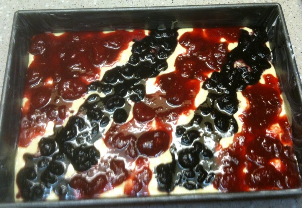 I’ve always made it the way the recipe says, with strawberries. Making it today, for the 4th of July, I suggested to Rich that while we eat this red and white cake we hold our breath ’til we turn blue, just to make it appropriately patriotic. He suggested adding blueberries instead. So I faked a blueberry combination similar to the strawberry one, and put it on in diagonal stripes.