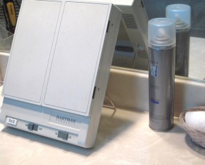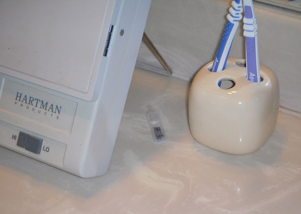 Take another look at that photo. Right beside the eyedrop container, you’ll notice a toothbrush holder. (Both those toothbrushes are mine. Following our dentist’s suggestion, we each have two toothbrushes, one for morning and one for night. Most oral bacteria die within 24 hours, so that gives us a clean, germ-free toothbrush each time.) (See, I wasn’t kidding when I said I take care of my teeth.)