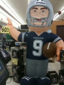 Yes, that’s a ten-foot-tall inflatable Tony Romo. The price when I took the photo a few weeks ago was $39.99. It’s now reduced to $29.99. First of all, can anyone tell me why they have this to sell? I mean, seriously, who bought them? For what purpose? What would you do with it? Secondly, and—really—this is the point: If you want to add to your collection of Very Large Inflatables of Sports Figures Who Never Should Have Gotten Involved With Jessica Simpson, you better act fast. At this price, they’re not going to be around…oh, never mind!