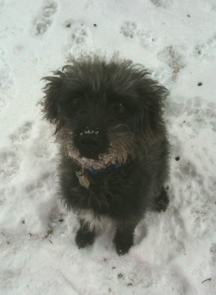 Andy in the snow. (It’s the same photo I put on Facebook. I rather like it.) There’s snow on his muzzle because he was snuffling in the snow, finding things and eating them. I don’t think it was, um, anything the feral cats left there, because they don’t come into the pool yard any more. I think it was acorns. Yeah. We’ll go with acorns. In any case, he was having lots of fun, tearing around madly, until I insisted he stop so I could take his picture. He continued having fun immediately after this.