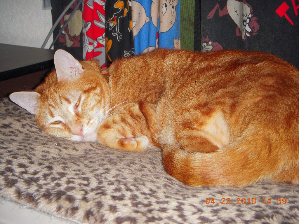 Does anybody else have a cat who loves plants? I mean, “loves” as in to eat? Rocky, who started out as about the saddest of all our hard luck cases, can’t get enough plant matter. If I don’t feed him some kind of greenery fairly regularly, he chews on the house plants. Every now and then, like this morning, I walk into the master bathroom and discover my windowsill African violet and orchid farm looks like it’s been ravaged. Rocky…!