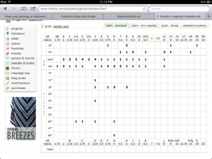 I spent a rollicking Saturday evening doing an inventory of my knitting needles. (Because I find, over and over, that I need an actual, correct and complete tally of them, that’s why. Sometimes I spend time searching for needles that meet particular criteria when I’m not absolutely positive that I even own them. Or I find myself thinking that I need to buy some needles that are [fill in the blank] size or whatever, when, for all I know, the very ones I want are stuck up in a closet somewhere in my house.)