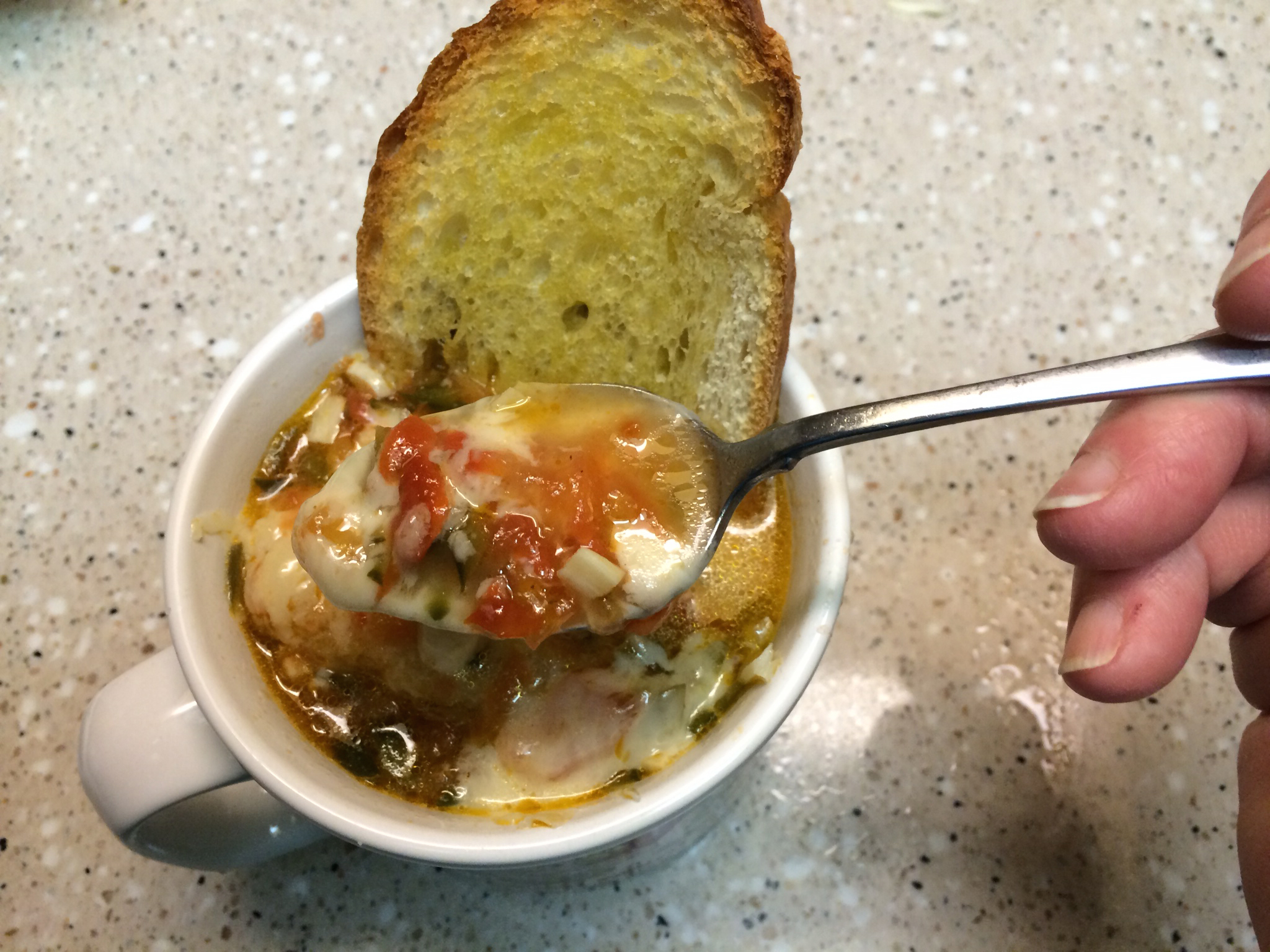 I part ways with the Whole Foods recipe just at that point. Personally, I use the bread and copious amounts of grated Monterrey Jack cheese…
