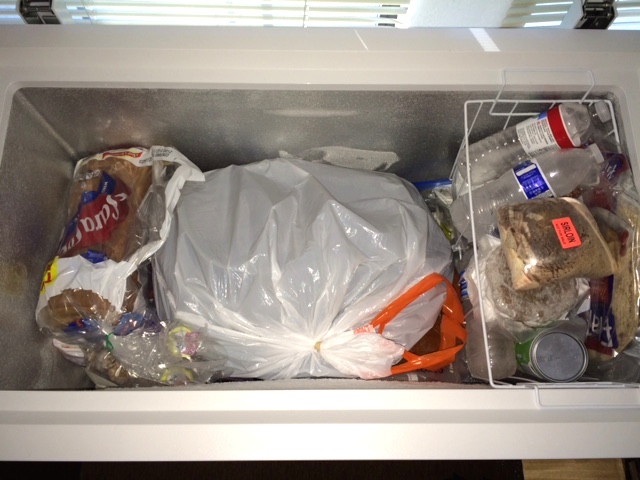 Today I finally did something with it. I tried to put it through a cycle of the dryer, with it resting on the “tennis shoe” rack that hooks on the door. Nothing doing—some part of it kept catching on the drum as it turned, flinging it around wildly and wedging it in various tight spaces so that I had trouble opening the door. So, going back to square one, I just took the temperature in our little chest freezer. As long as the temperature is below 0°F, you can freeze bed bugs. You just have to keep them that cold for…wait for it…four days!